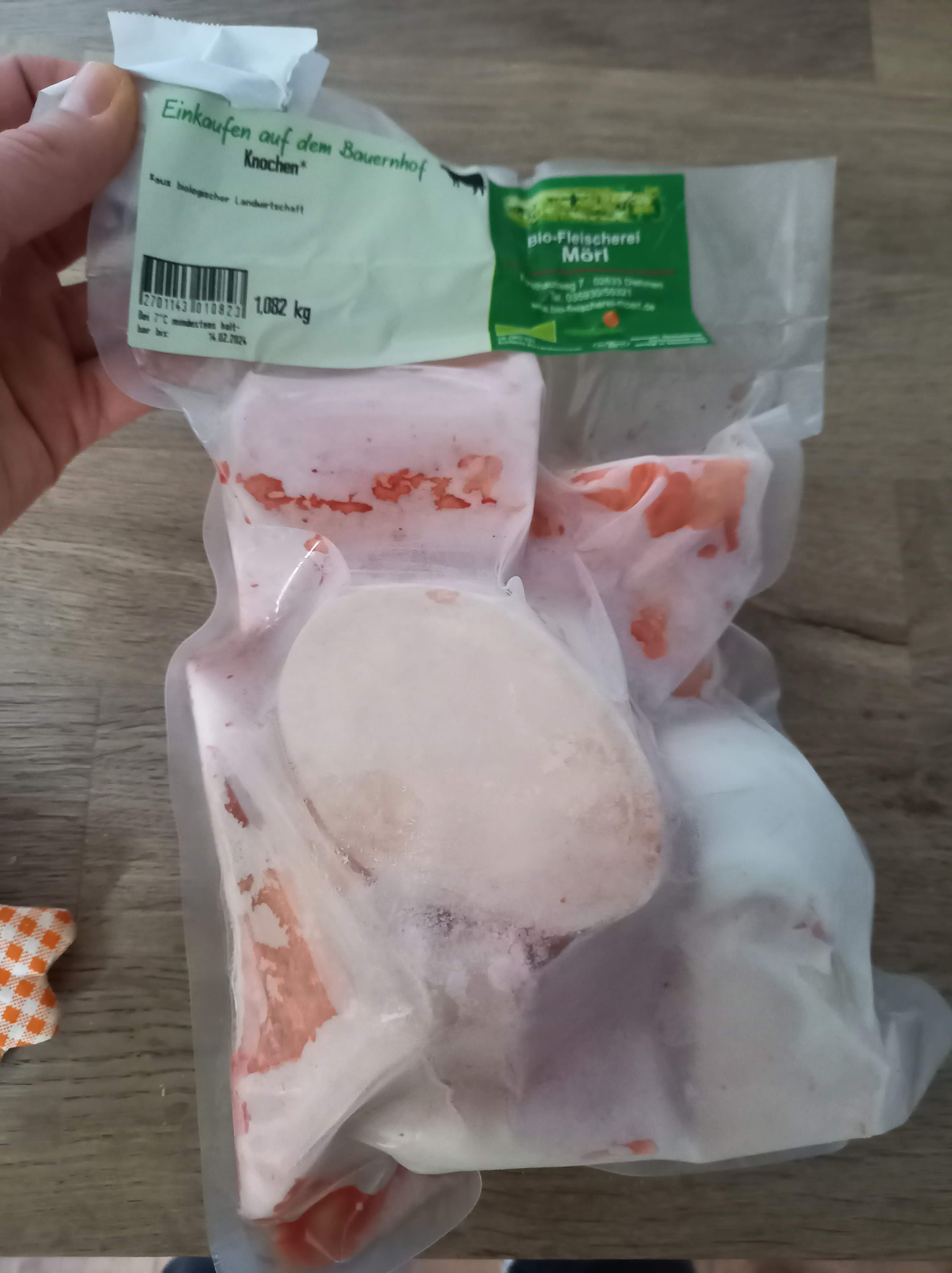 - 1,5 – 2 Kilo Knochen (am besten ein Mix aus Sand-, Mark- und Geflügelknochen)