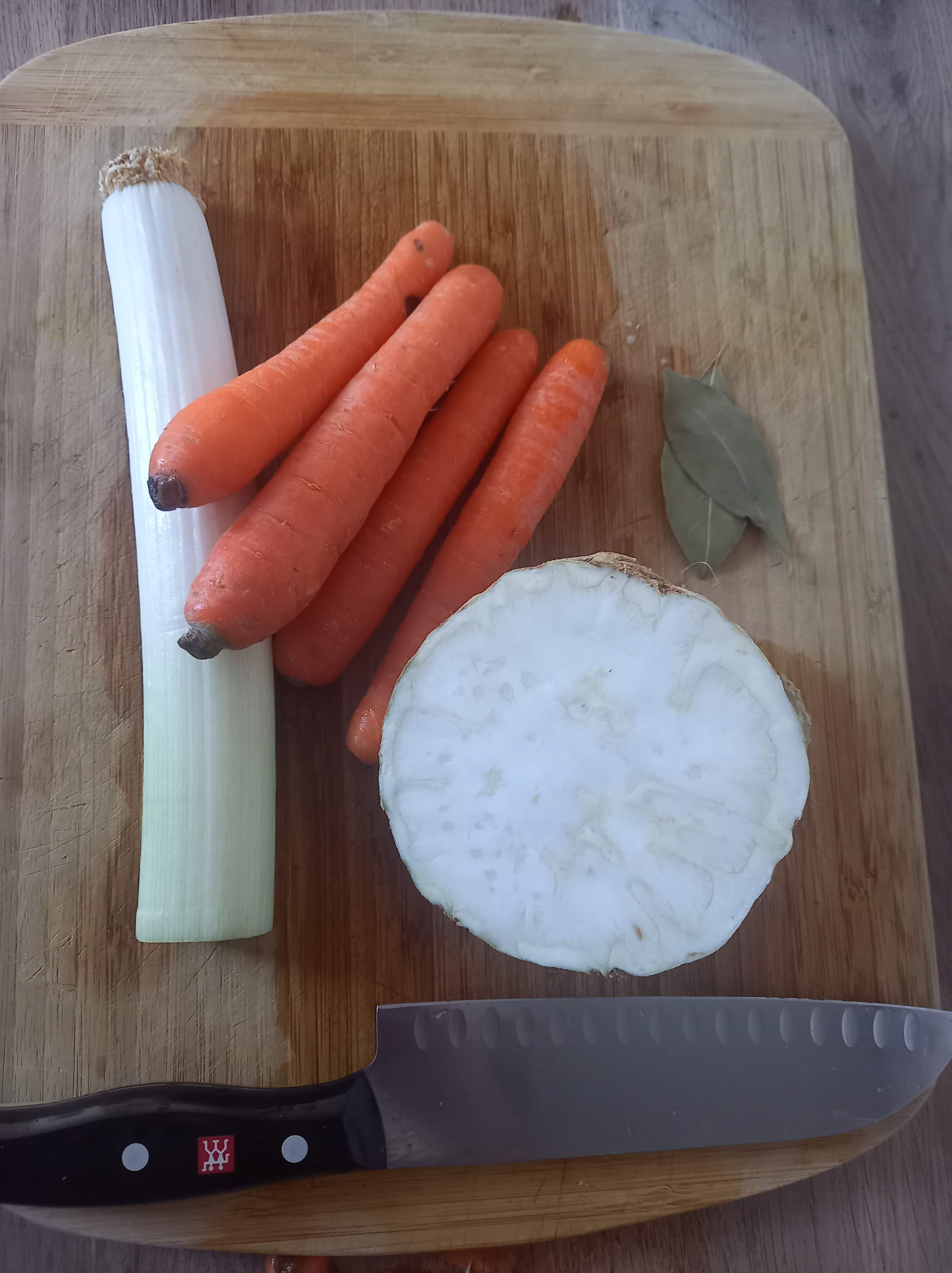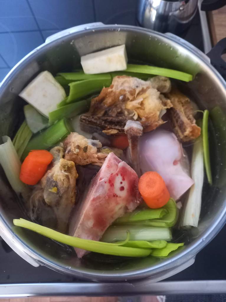 Das Gemüse waschen, putzen und in grobe Stücke schneiden. Anschließend zusammen mit den Knochen und den Lorbeerblättern in den Schnellkochtopf geben und zu maximal 2/3 mit Wasser aufgießen, dabei sollte der Inhalt möglichst mit Wasser bedeckt sein.