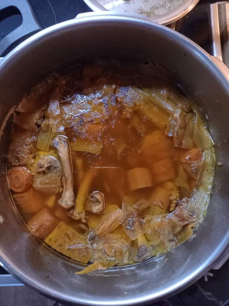 Den Schnellkochtopf verschließen, Garstufe 2 wählen und auf dem Herd zunächst auf höchster Stufe erhitzen. Sobald sich das Ventil geschlossen und der Kochvorgang im Topf begonnen hat, die Temperatur am Herd herunterregeln und die Brühe nun für mindestens 4 Stunden (je länger je besser) köcheln lassen.