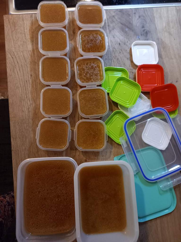 Zum Schluss die Brühe nach Belieben in Tupperdosen abfüllen, auf Zimmertemperatur herunterkühlen lassen und im Gefrierschrank verstauen.