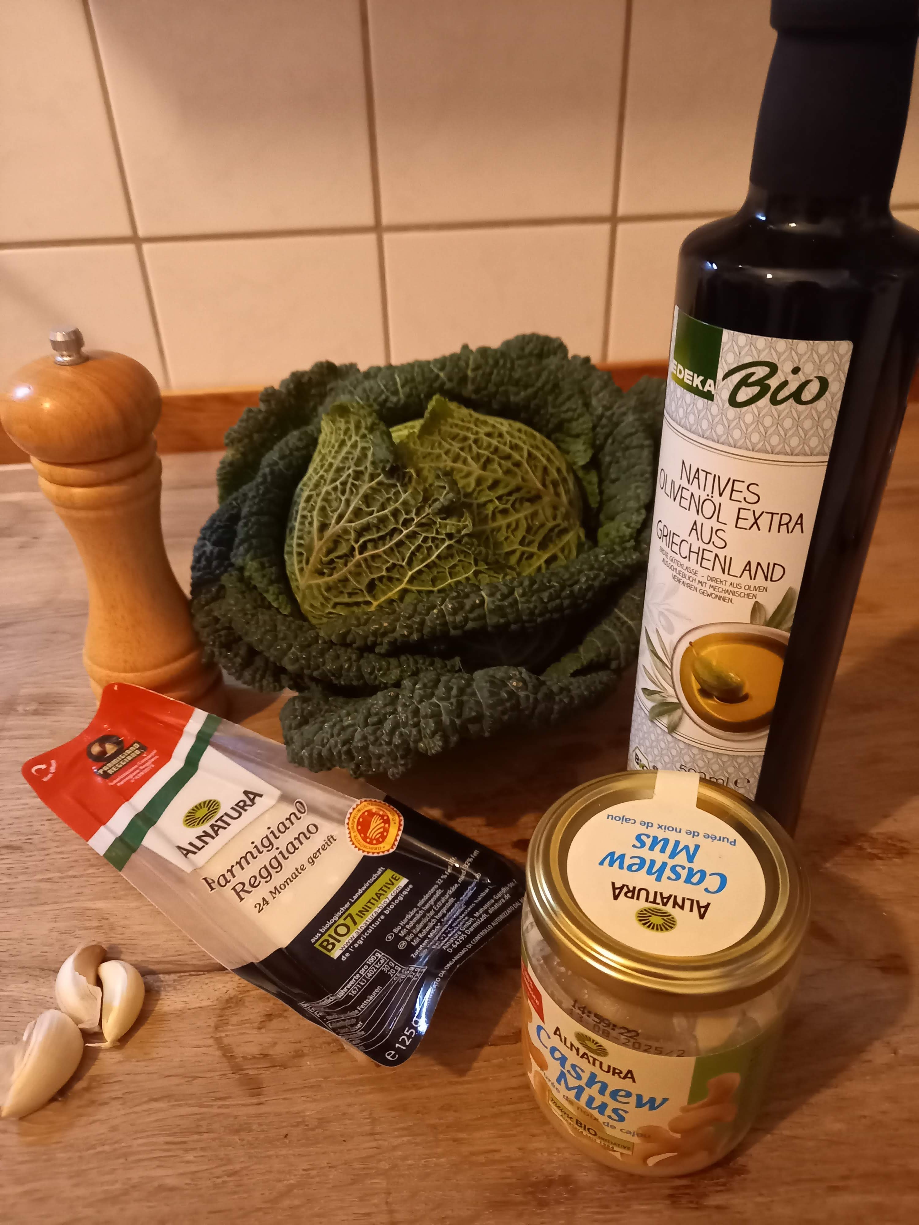 Die Spaghetti nach Packungsanleitung kochen. Den halben Wirsing von den äußersten Blättern befreien, gründlich waschen und in grobe Streifen schneiden. Anschließend in einen Topf mit wenig (!) kochendem Wasser geben und die abgezogenen Knochblauchzehen ungehackt direkt dazugeben. Den Wirsing und Knoblauch circa 30min kochen lassen, anschließend mit einer Lochkelle aus dem Kochwasser nehmen und in einen hohen Messbecher geben. Das Olivenöl, den Parmegiano und das Nussmus hinzugeben und die Mixtur nach Belieben pfeffern. Nun mit dem Stabmixer ein cremiges Pesto daraus pürieren. Die Nudeln mit dem Pesto auf Tellern anrichten und mit gehobeltem Parmegiano dekorieren.