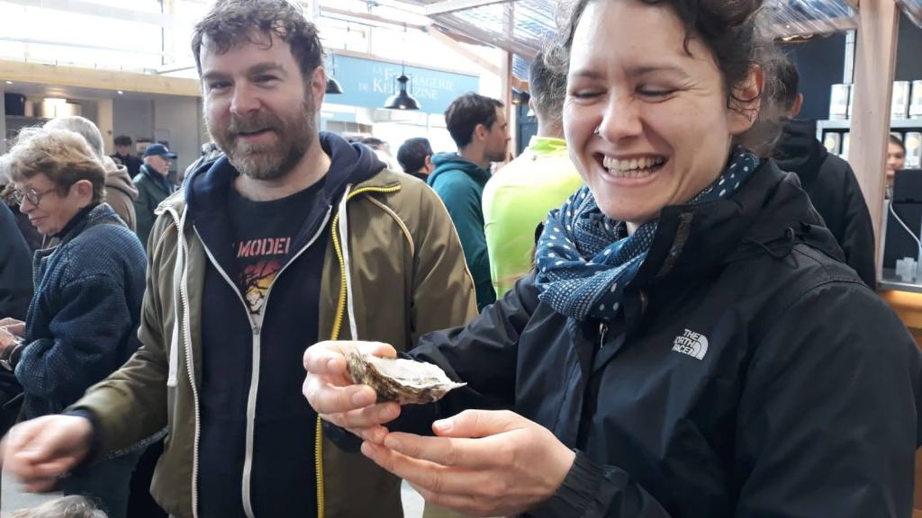 Gesagt, getan. In der örtliche Markthalle (Les Halles de Merville) wurden wir fündig. Glücklicherweise hatten wir mit Rémis bretonischem Freund und Kollegen Gaël einen hervorragenden Local Guide am Start, der für uns die Gesprächsführung mit einem der Fischhändler übernahm. Als die beiden dann genügend darüber gefachsimpelt hatten, welche Muschel die ideale Probiergröße hat, durfte ich endlich verkosten und war richtiggehend nervös. Zu häufig habe ich von Leuten gehört, die wegen der salzigen, schlabbrigen Konsistenz der Muscheln das blanke Würgen bekamen.