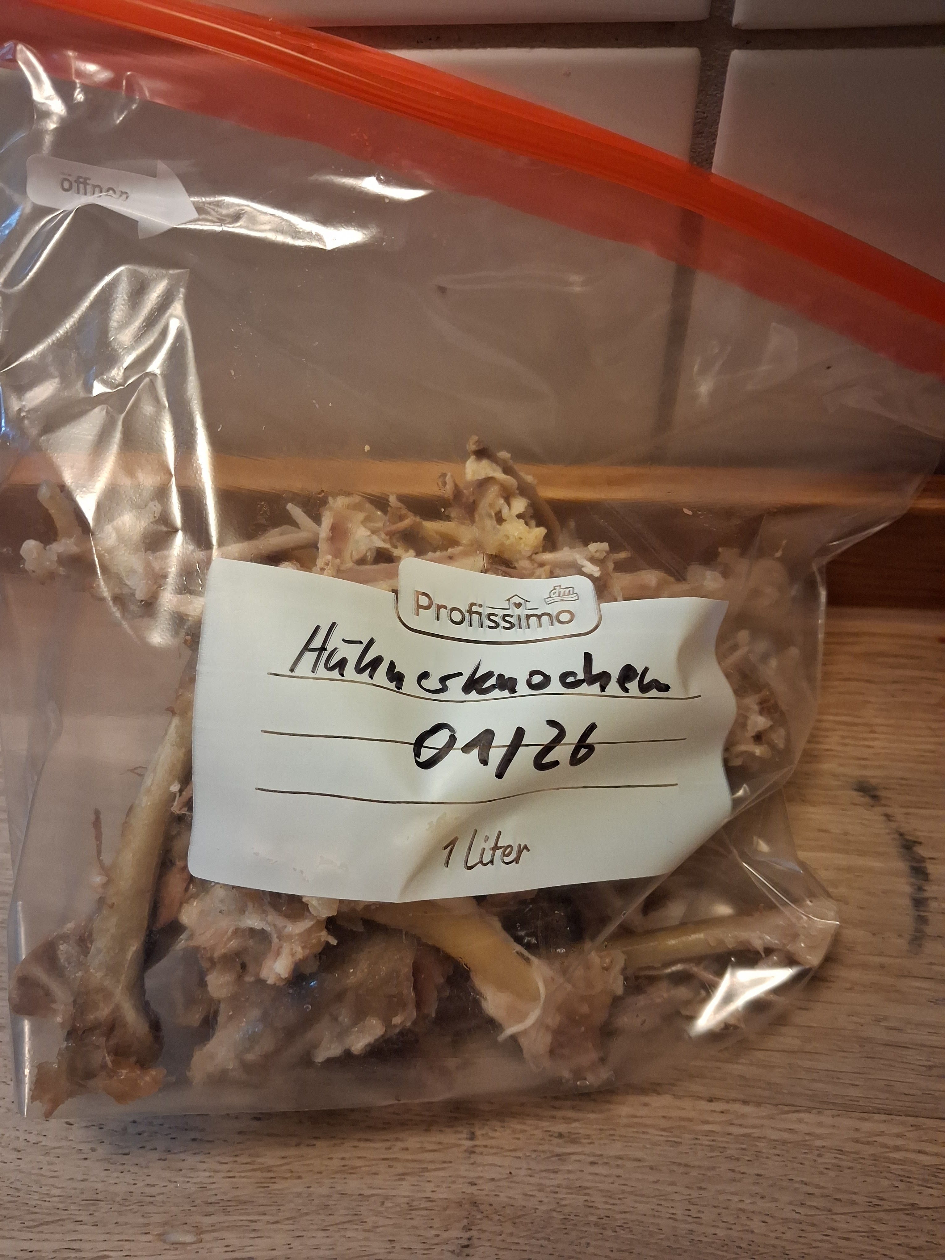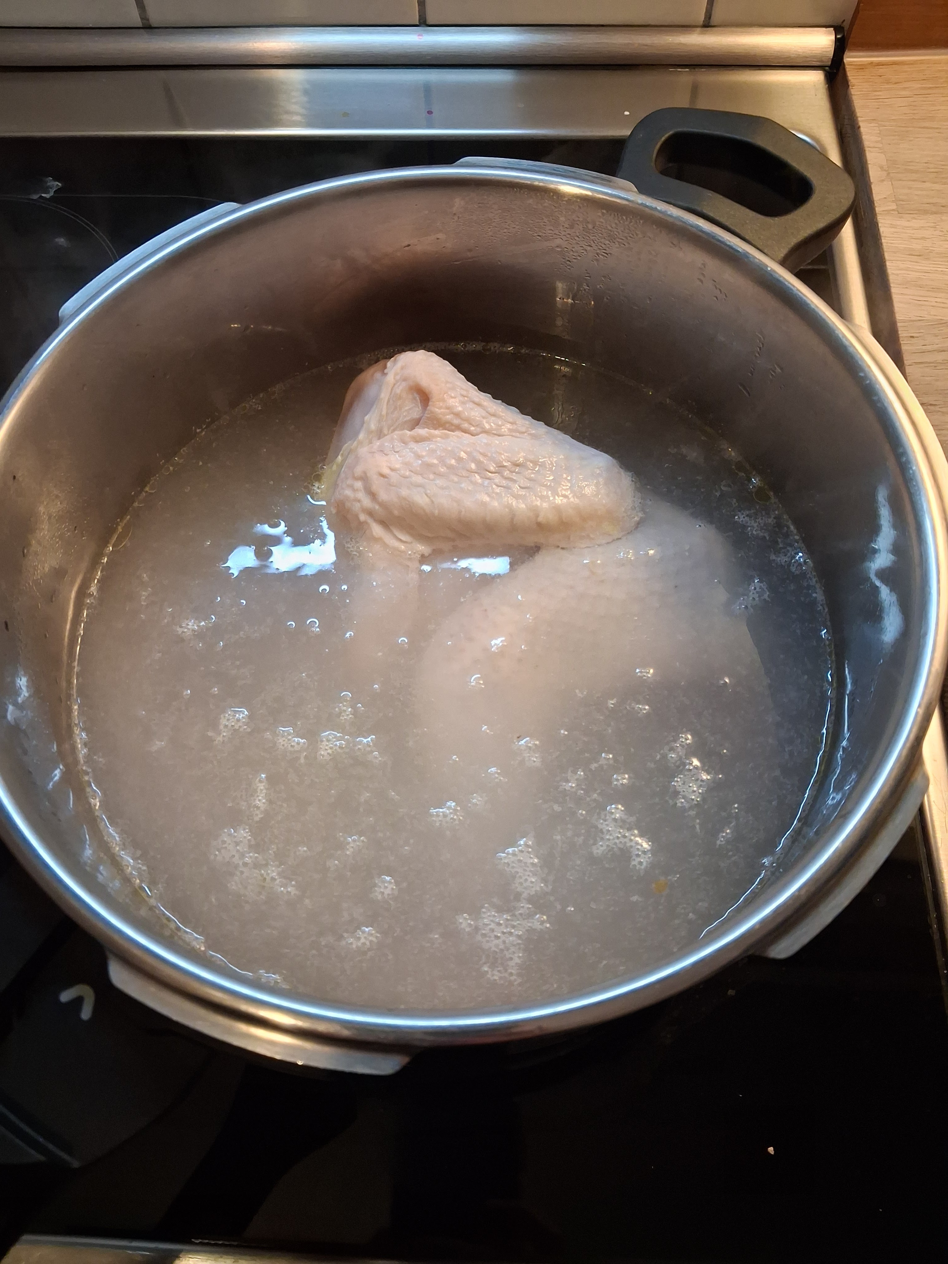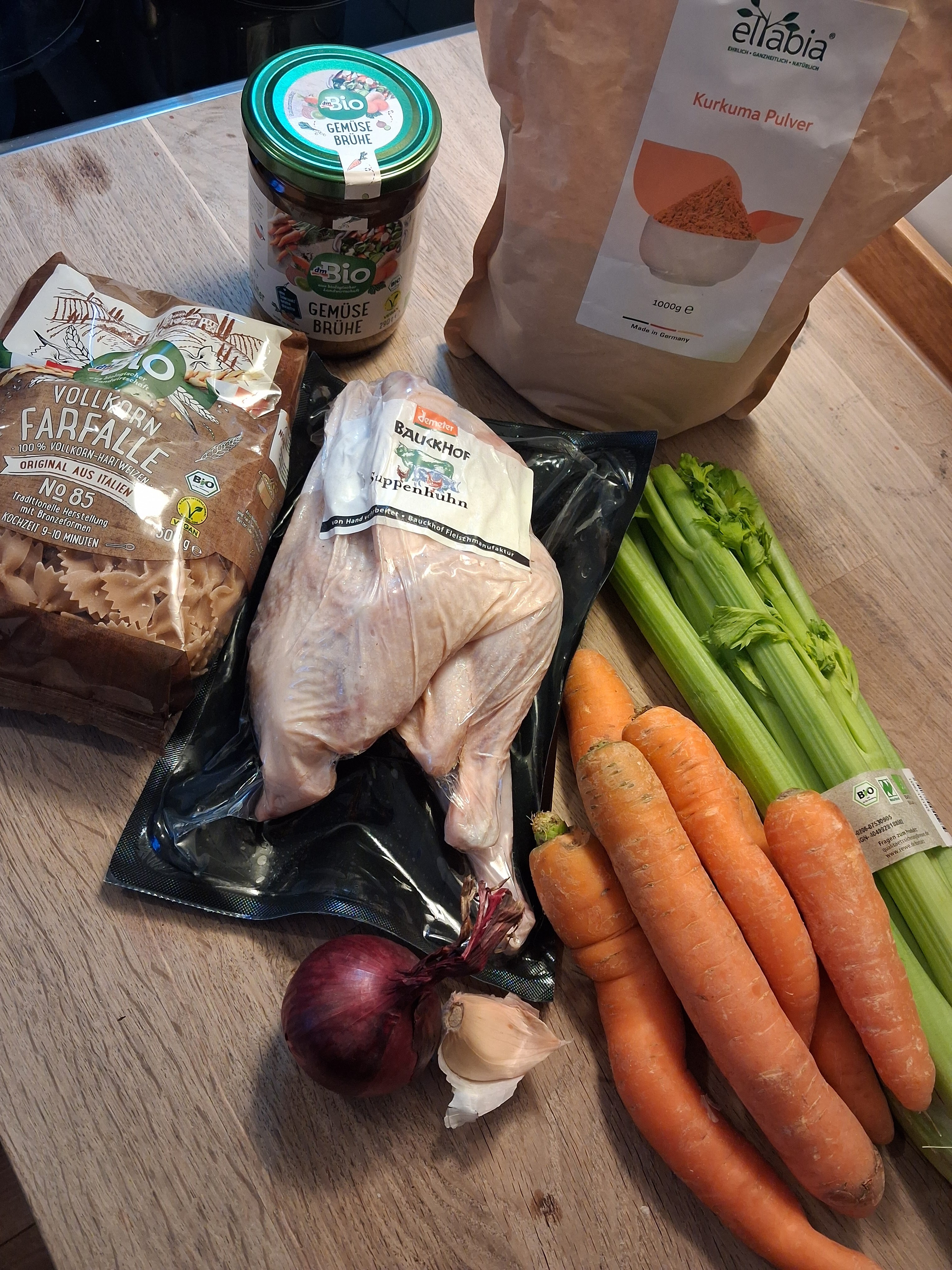 Das Huhn ggf. auftauen lassen und in einem ausreichend großen Suppentopf mit kaltem (!) Wasser bedecken. Einen kleinen TL Essig hinzufügen und die Brühe bei mittlerer Hitze mindestens 2,5, besser 3-4 Stunden simmern lassen. Ein Schnellkochtopf (den ich sehr empfehle) verkürzt die Kochzeit auf Stufe 2 auf etwa 1 Stunde.