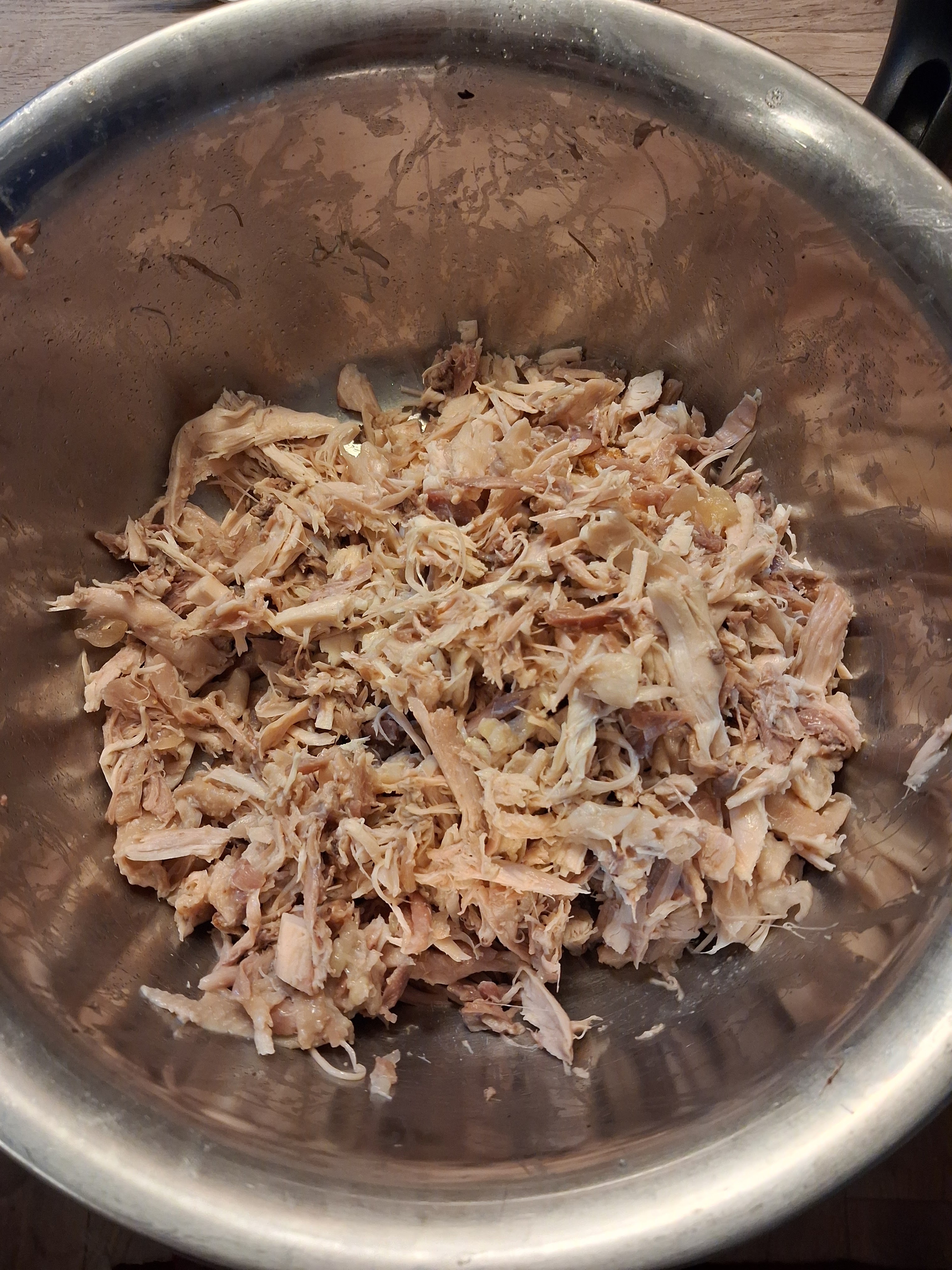 Anschließend die Brühe zurück in den Topf geben. Nun das Fleisch von den Knochen lösen und mit den Händen zerzupfen, dabei gründlich nach kleinen Knochen suchen und diese entfernen.