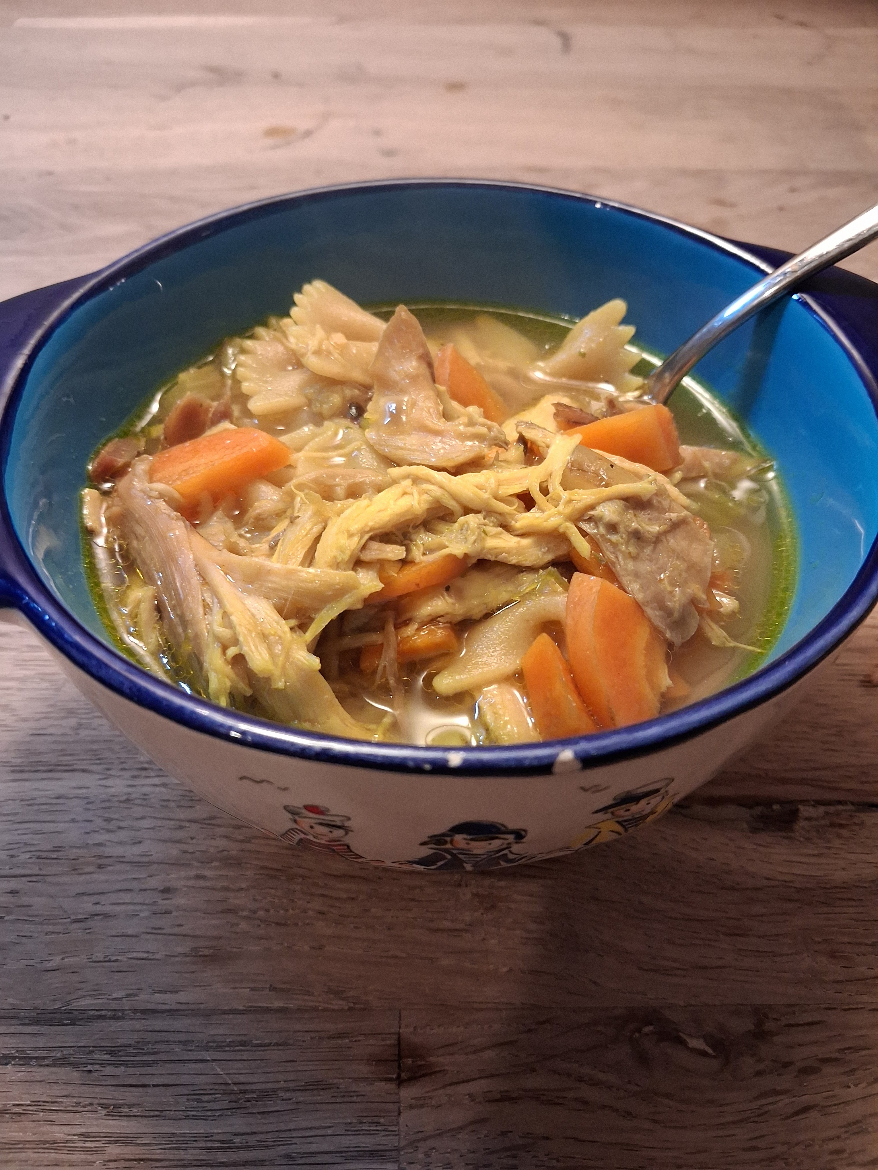 Das zerzupfte Hühnerfleisch zusammen mit dem gedünsteten Gemüse wieder in die Brühe geben, Instant-Gemüsebrühe und Kurkuma hinzugeben und kurz aufkochen lassen. Nudeln hinzugeben und circa 10 min mitkochen, bis sie al dente sind. Mit Pfeffer und Salz abschmecken und servieren.